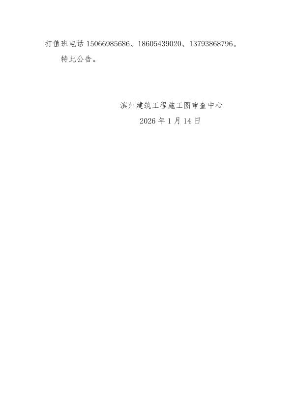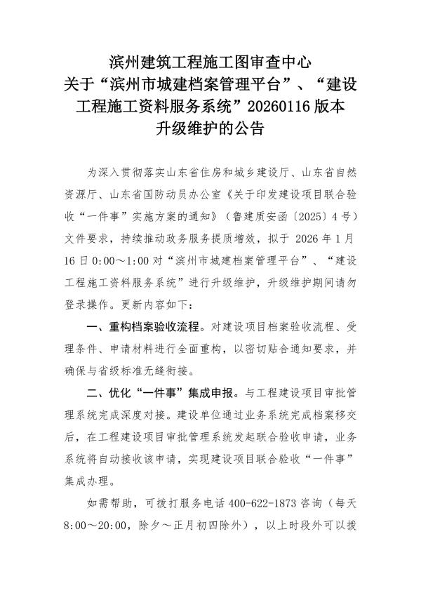 滨州建筑工程施工图审查中心关于“滨州市城建档案管理平台”、“建设工程施工资料服务系统”20260116版本升级维护的公告