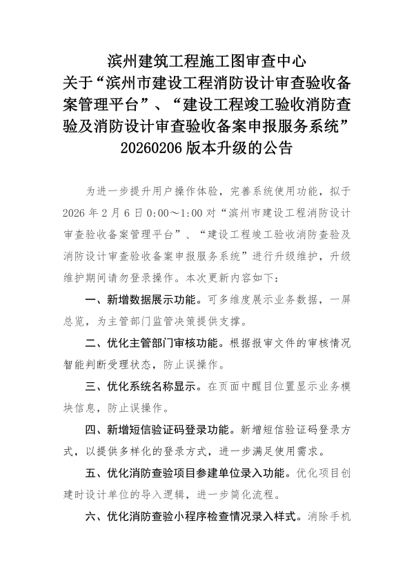 关于“滨州市建设工程消防设计审查验收备案管理平台”、“建设工程竣工验收消防查验及消防设计审查验收备案申报服务系统”升级的公告