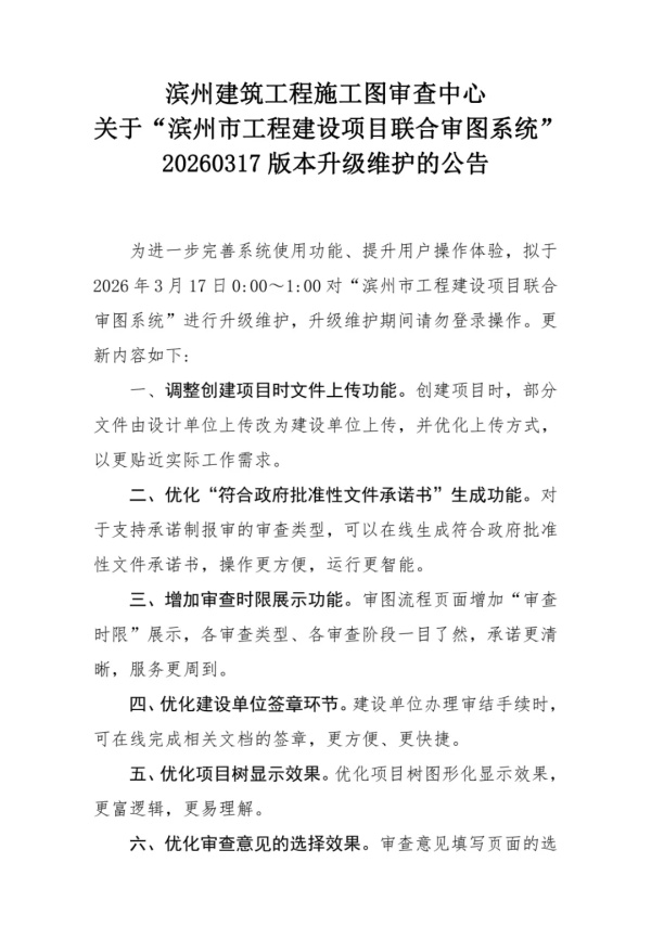 滨州建筑工程施工图审查中心关于“滨州市工程建设项目联合审图系统”20260317版本升级维护的公告